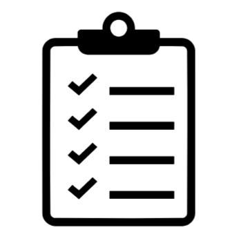 • Black and white illustration of a clipboard with a checklist containing five check marks and blank lines.